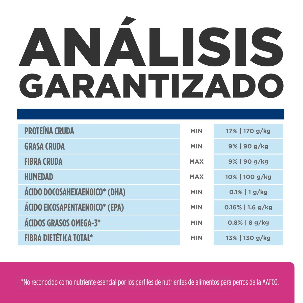 COMPONENTES ANALÍTICOS: Proteína 21,0%, Contenido en grasa 13,4%, Ácidos grasos omega-3 1,2%, EPA 0,20%, DHA 0,14%, Fibra bruta 6,6%, Ceniza bruta 6,0%, Calcio 1,0%, Fósforo 0,66%, Sodio 0,37%, Potasio 0,84%, Magnesio 0,10%; por kg: Vitamina A 9.760UI, Vitamina D3 650UI, Vitamina E 700mg, Vitamina C 110mg, Beta-caroteno 1,5mg.