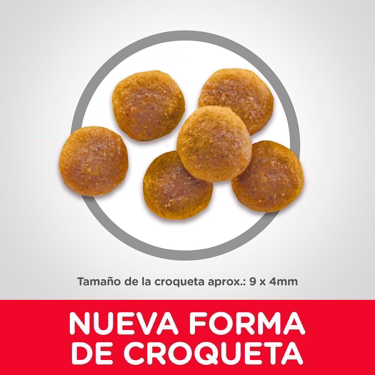 Ajuste la cantidad de alimento según sea necesario para mantener el peso óptimo. Si tiene dudas, consulte a su veterinario. ¿Nuevo en este alimento? Mezcle cantidades cada vez mayores del alimento nuevo de su mascota con cantidades cada vez menores del alimento anterior durante un periodo de 7 días. ¡Mantenga agua fresca disponible en todo momento! Las necesidades nutricionales de su mascota pueden cambiar con la edad. Pregunte a su veterinario en cada revisión. Para prevenir asfixia, mantenga el empaque fuera del alcance de mascotas y niños. 4021 kcal/kg (502 kcal/cup†)
