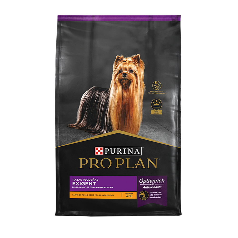 Exigent Razas Pequeñas Provee nutrición que podrás percibir por medio de un pelaje sano y brillante con un sabor único que los perros de razas pequeñas con los paladares más exigentes disfrutaran. Nutrición de vanguardia que satisface las necesidades específicas de perros adultos de razas pequeñas con paladares exigentes, para que alcancen un estado de salud óptima y un bienestar general.