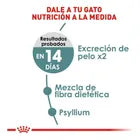 Hairball de Royal Canin es para gatos a partir de 1 año de edad, con mayor predisposición a la formación de bolas de pelo (ej. gatos de pelo largo). Una combinación de diferentes tipos de fibras que estimula el tránsito intestinal y ayuda a facilitar la eliminación del pelo que su gato traga todos los días.