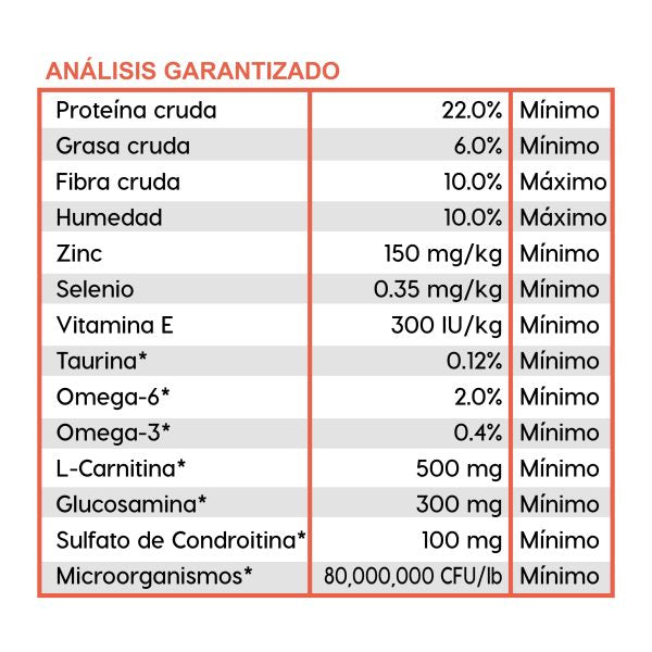 Harina de carne de cordero, chícharos, garbanzos, lentejas, camote, fibra insoluble, papas, grasa de pollo (conservada con tocoferoles mixtos), linaza, sabor natural, harina de pescado de mar, aceite de pescado menhaden (conservado con tocoferoles mixtos) , cloruro de colina, raíz de achicoria seca, L-carnitina, clorhidrato de glucosamina, col rizada, semilla de chía, calabaza, arándanos, naranjas, quinua, algas secas, coco, espinacas, zanahorias, papaya, extracto de yucca schidigera, Lactobacillus acidophilus seco producto de fermentación, fermentación seca de Bifidobacterium animalis, producto de fermentación de Lactobacillus reuteri seco, vitamina E, sulfato de condroitina, proteinato de hierro, proteinato de zinc, proteinato de cobre, sulfato ferroso, sulfato de zinc, sulfato de cobre, yoduro de potasio, mononitrato de tiamina (vitamina B1), manganeso proteinato, óxido manganoso, ácido ascórbico, suplemento de vitamina A, biotina, niacina, pantotenato de calcio, sulfato de manganeso, sodio, selenita, clorhidrato de piridoxina (vitamina B6), vitamina B12, riboflavina (vitamina B2). ), suplemento de vitamina D3, ácido fólico. Contiene una fuente de microorganismos vivos, de origen natural.