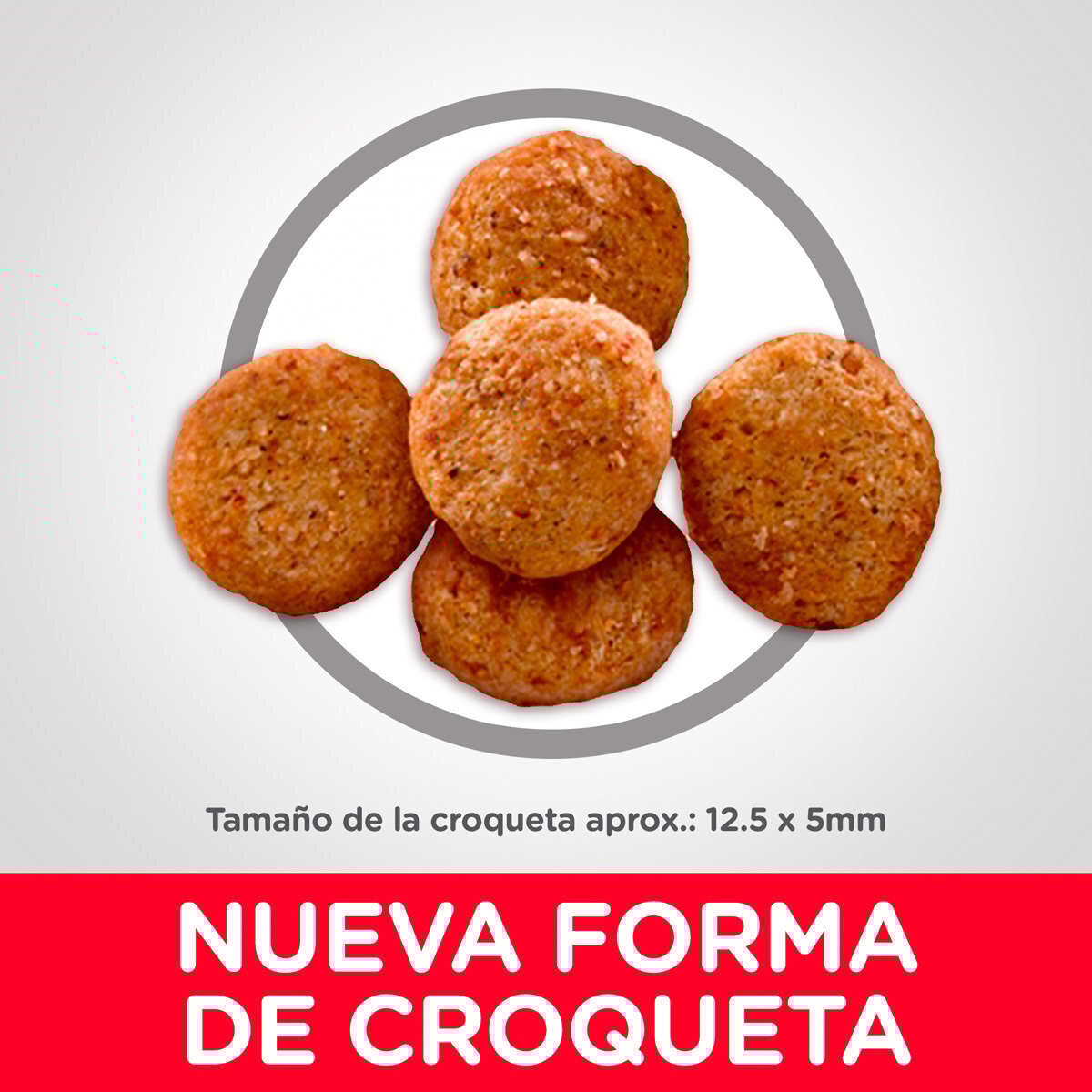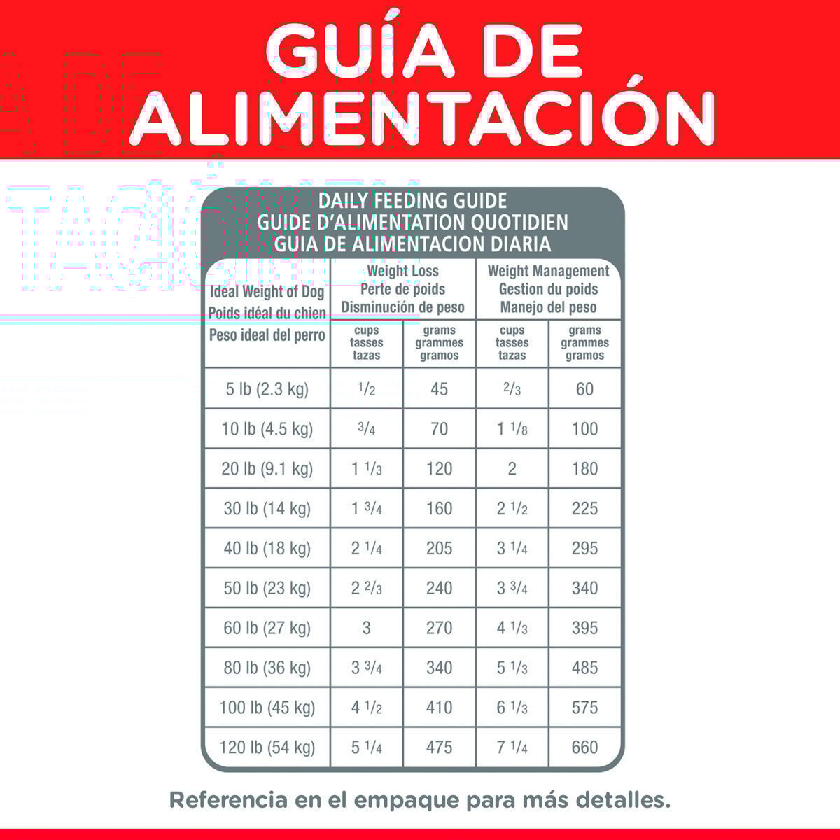Ajuste la cantidad de alimento según sea necesario para mantener el peso óptimo. Si tiene dudas, consulte a su veterinario. ¿Nuevo en este alimento? Mezcle cantidades cada vez mayores del alimento nuevo de su mascota con cantidades cada vez menores del alimento anterior durante un periodo de 7 días. ¡Mantenga agua fresca disponible en todo momento! Las necesidades nutricionales de su mascota pueden cambiar con la edad. Pregunte a su veterinario en cada revisión. Para prevenir asfixia, mantenga el empaque fuera del alcance de mascotas y niños.