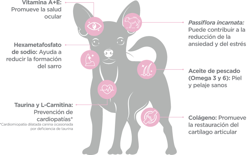 Un perro de talla miniatura es más longevo que un perro de raza mediana o grande, por lo que integramos a su dieta inmunoestimulantes y antioxidantes naturales. También pueden llegar a ser nerviosos; por eso, NUPECMR SENIOR Razas Mini contiene Passiflora incarnata que puede ayudarles a disminuir el estrés. Suplementado con colágeno tipo II que ayuda a prevenir el desarrollo de la enfermedad articular*.