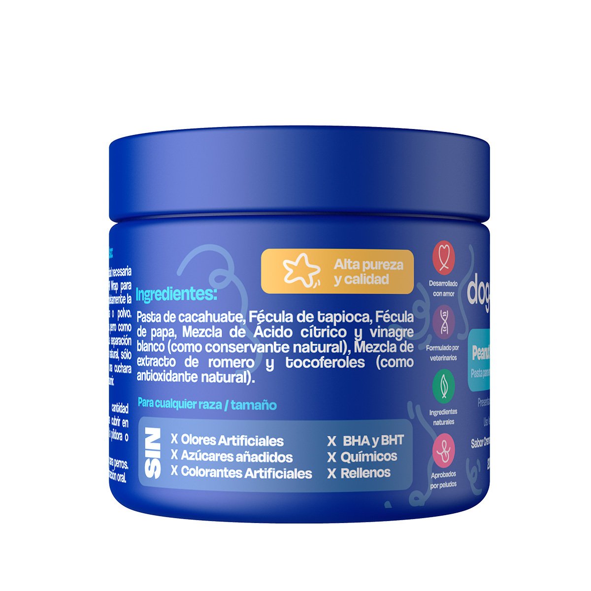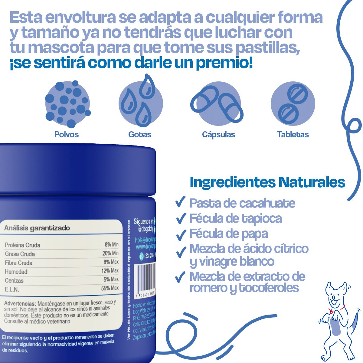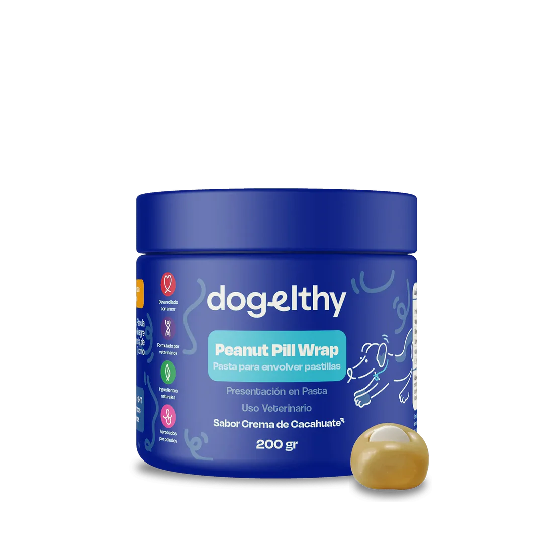 Pasta a base de cacahuate para envolver pastilllas El Peanut Pill Wrap es una solución fácil, rápida, deliosa y saludable para convertir la administración de medicamentos en una experiancia agradable para ti y para tu pequeño. El irresistible sabor y aroma a cacahuate ayuda a enmascarar el olor y sabor del medicamento, eliminando el estrés de la hora de su toma. Con esta envoltura que se adapta a cualquier forma y tamaño ya no tendrás que luchar con tu mascota para que tome sus pastillas.