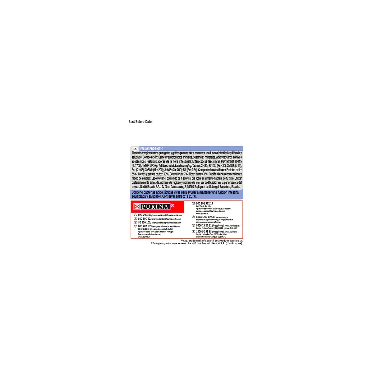 Contiene Prebiótico Contiene cantidades garantizadas de cultivos activos vivos. Un proceso propio de microencapsulamiento favorece su estabilidad, garantizando así los niveles de bacterias benéficas vivas que entran en el sistema digestivo del gato. Favorece la salud y el equilibrio intestinales. Favorece un sistema inmunológico saludable. Contiene altos niveles de antioxidantes. Es muy palatable.