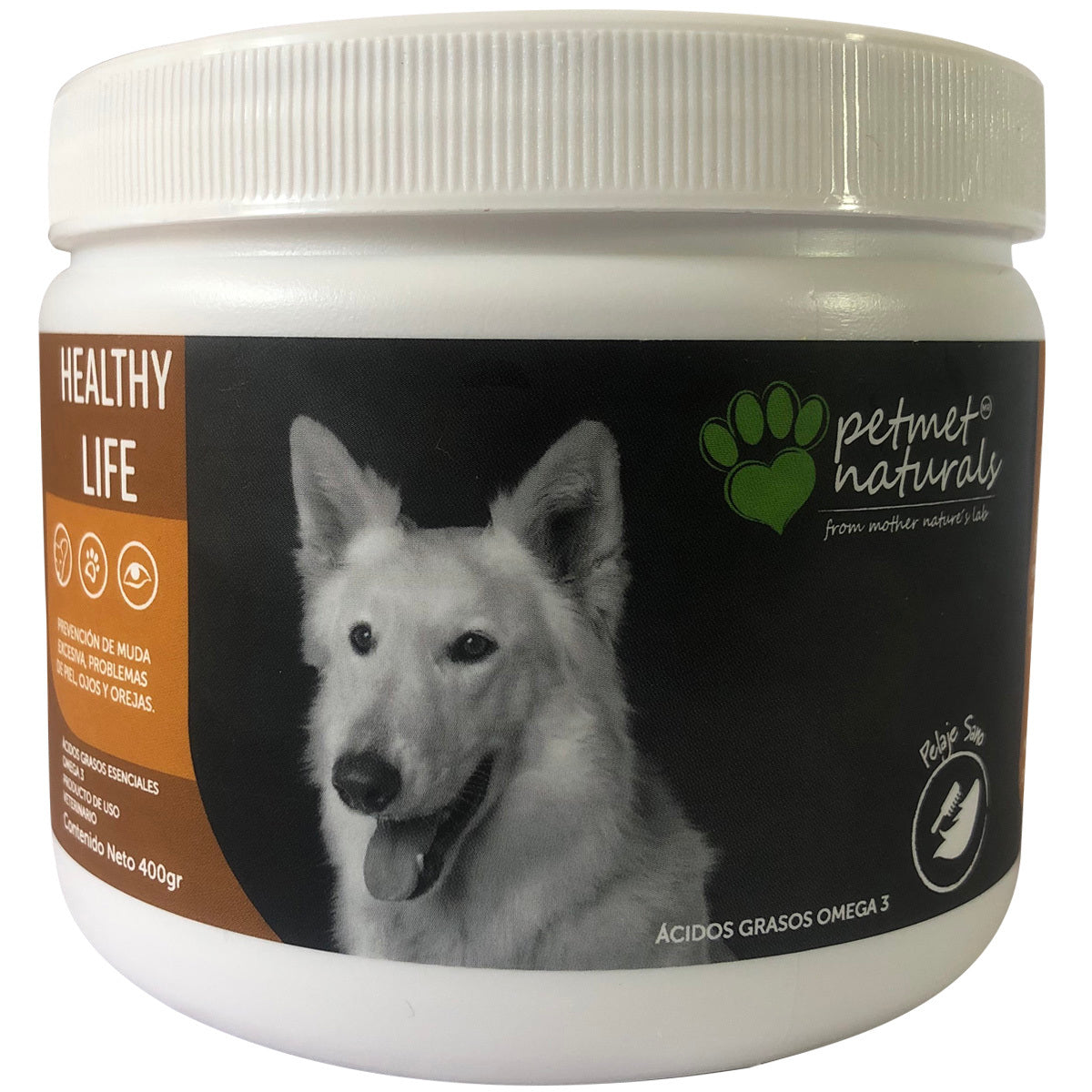 Petmet Naturals - Healthy Life Es un complemento alimenticio en polvo elaborado de aceite de pescado que mejora la calidad de vida del perro brindándole los Ácidos Grasos Esenciales Omega 3 que requiere en la ingesta diaria para evitar problemas comunes varios como: Caída excesiva de pelo. Enfermedades de piel Resequedad en orejas. Así como a promover una actividad cerebral mejor.